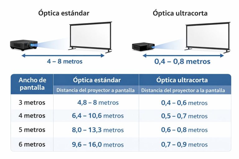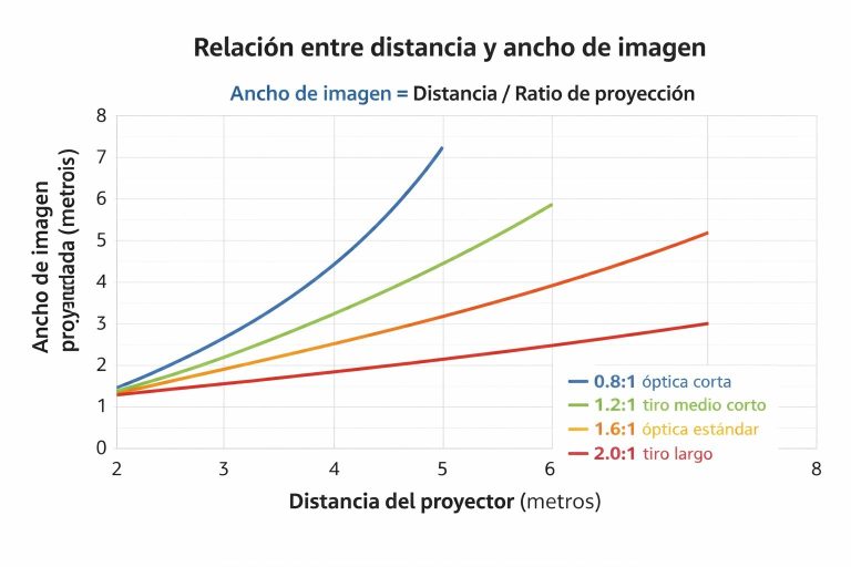 La distancia necesaria entre un proyector y la pantalla depende principalmente del tipo de óptica o ratio de proyeccióndel equipo. Cada proyector tiene una relación específica entre la distancia a la pantalla y el tamaño de la imagen proyectada.